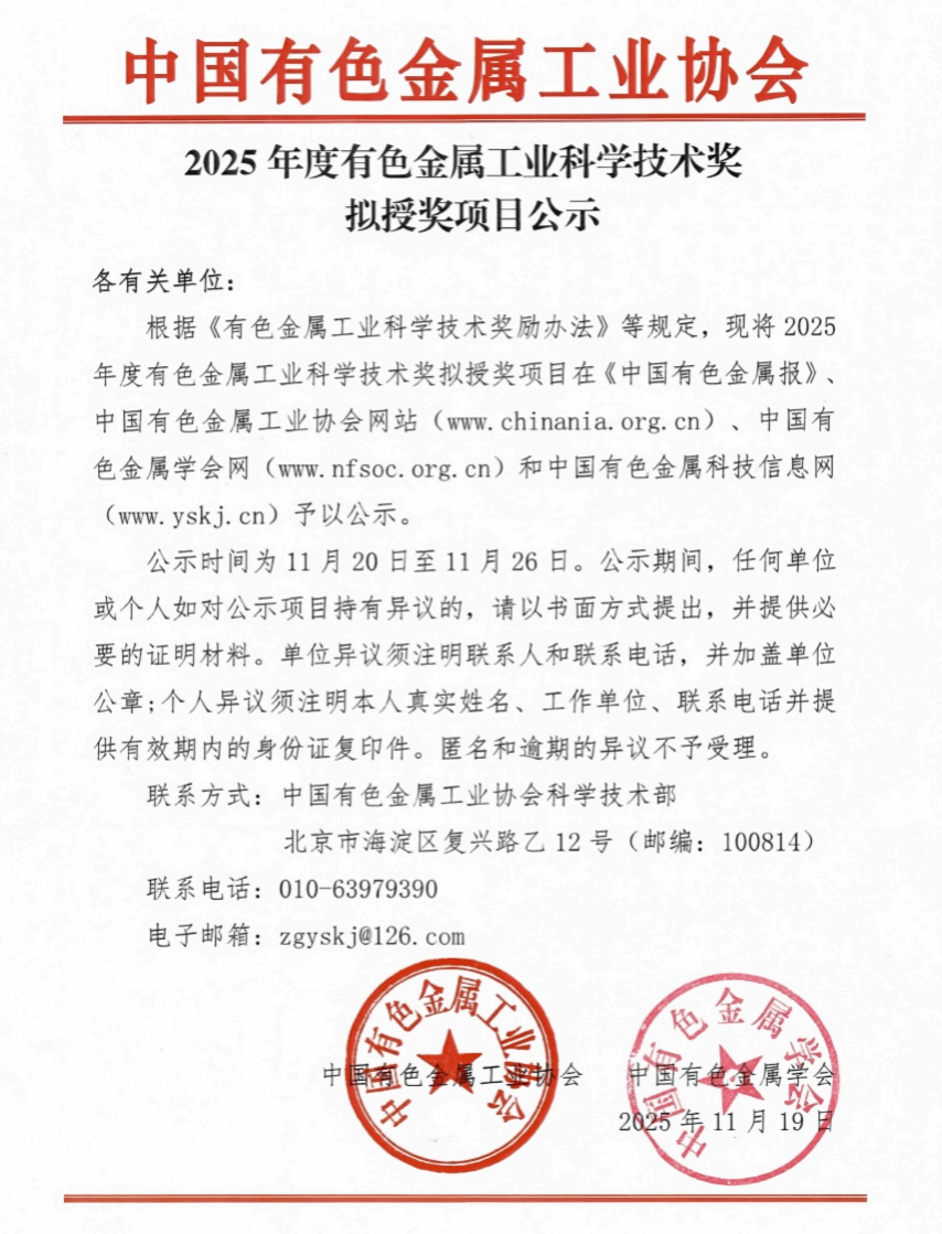 据悉,中国有色金属工业科学技术奖是经科技部备案,由中国有色金属学会和中国有色金属工业协会联合设立的省部级科技奖项,在有色金属行业具有较高的权威性与影响力。