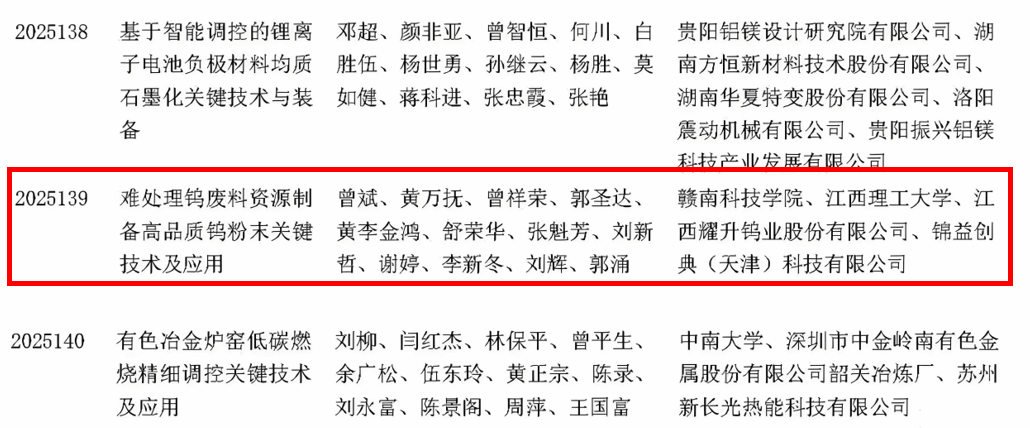 本网讯:12月02日,中国有色金属工业协会近期已经完成了《2025年度有色金属工业科学技术奖拟授奖项目》的公示。我校作为第一完成单位的项目《难处理钨废料资源制备高品质钨粉末关键技术及应用》喜获2025年度有色金属工业科学技术二等奖。
