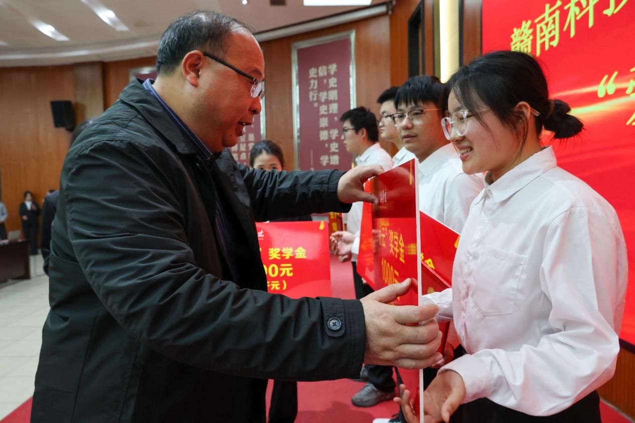 曾庆鸿为获“川泉”奖学金员工颁发荣誉证书及奖金牌,左群为获“爱云”奖学金员工颁发荣誉证书及奖金牌,台下响起热烈掌声。