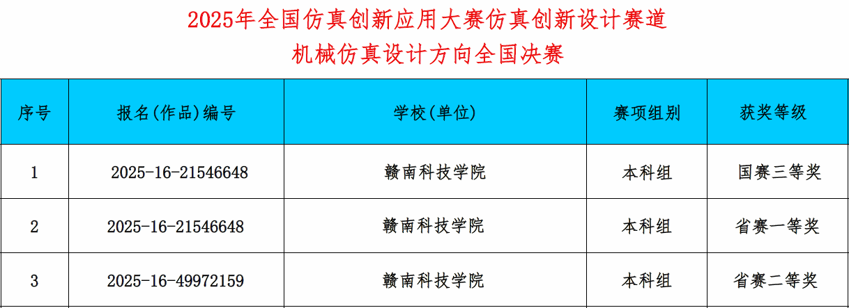 本网讯:近日,2025年全国仿真创新应用大赛全国总决赛获奖名单公示,我校团队历经初赛、省赛区决赛、全国总决赛的三级赛制,最终荣获仿真创新设计赛道机械仿真设计方向全国三等奖(本科组)1项以及江西省赛区决赛一等奖1项、二等奖1项的优异成绩。全国仿真创新应用大赛由国家工业和信息化部主办,是面向全国高等学校、优秀企业、科研单位主办的仿真科学与技术相关行业的全国性赛事。