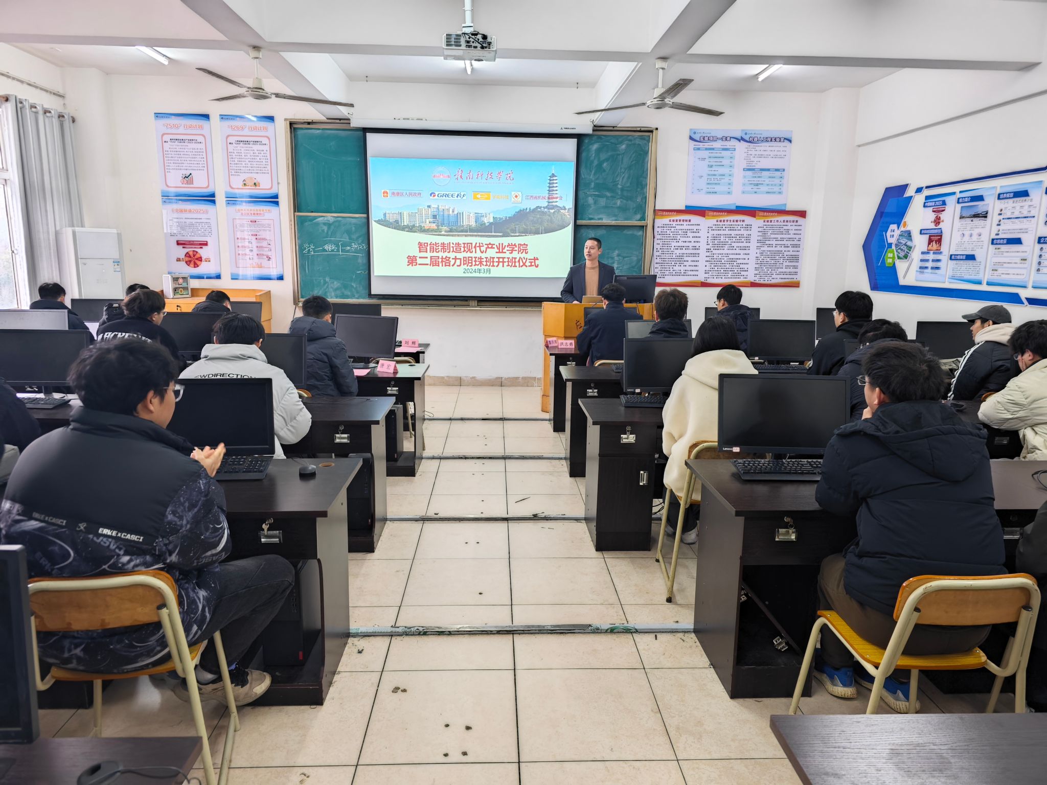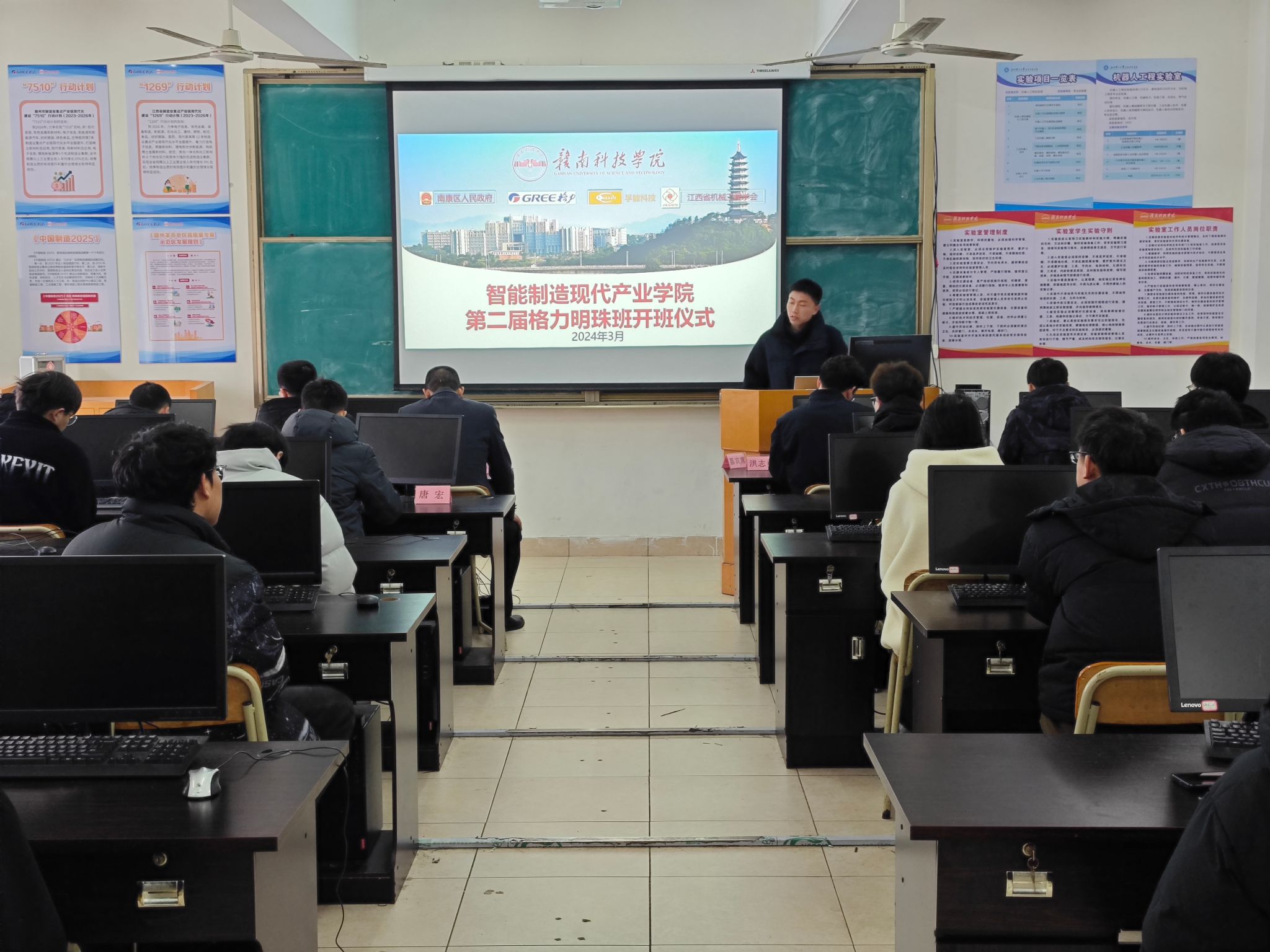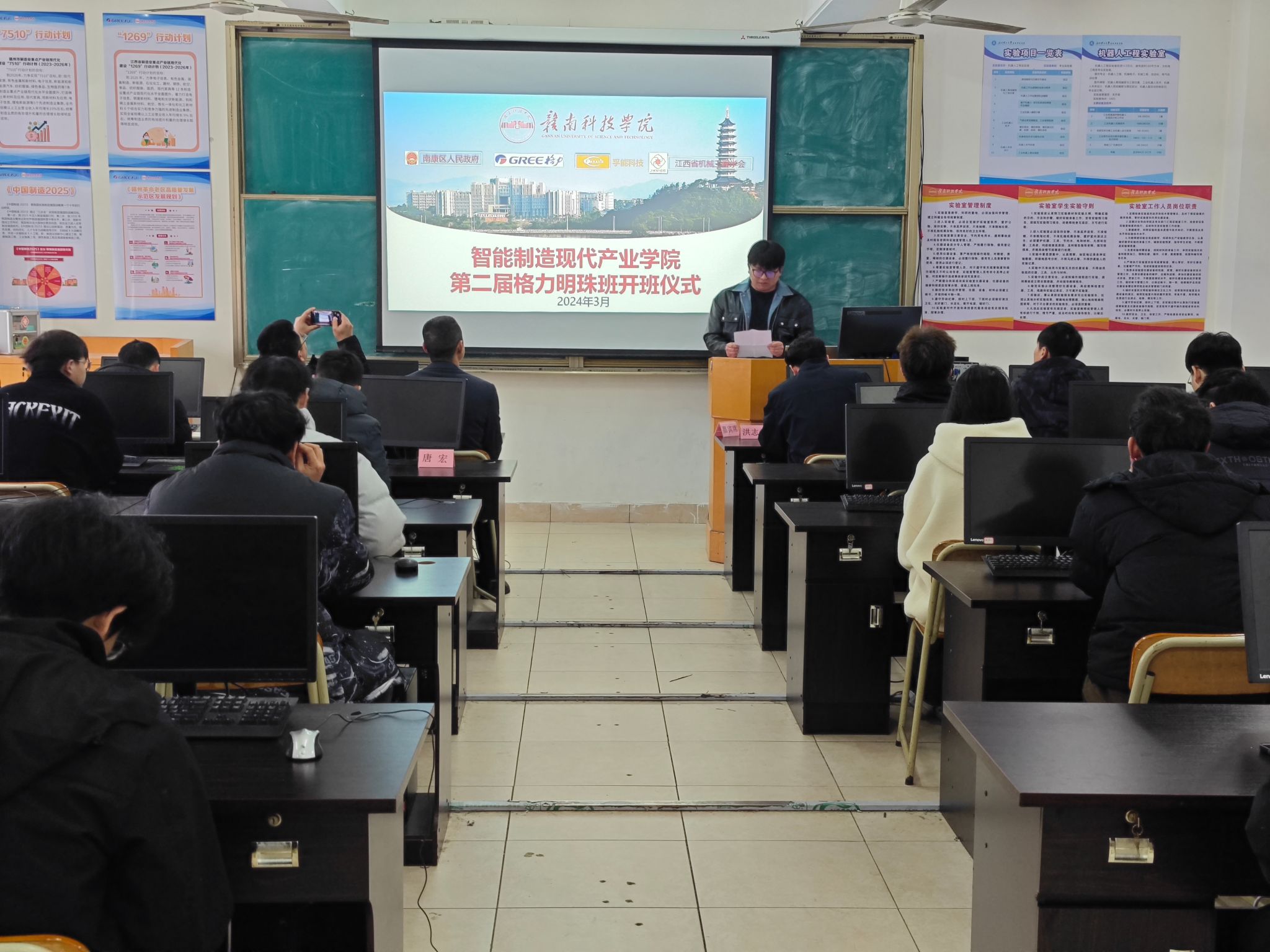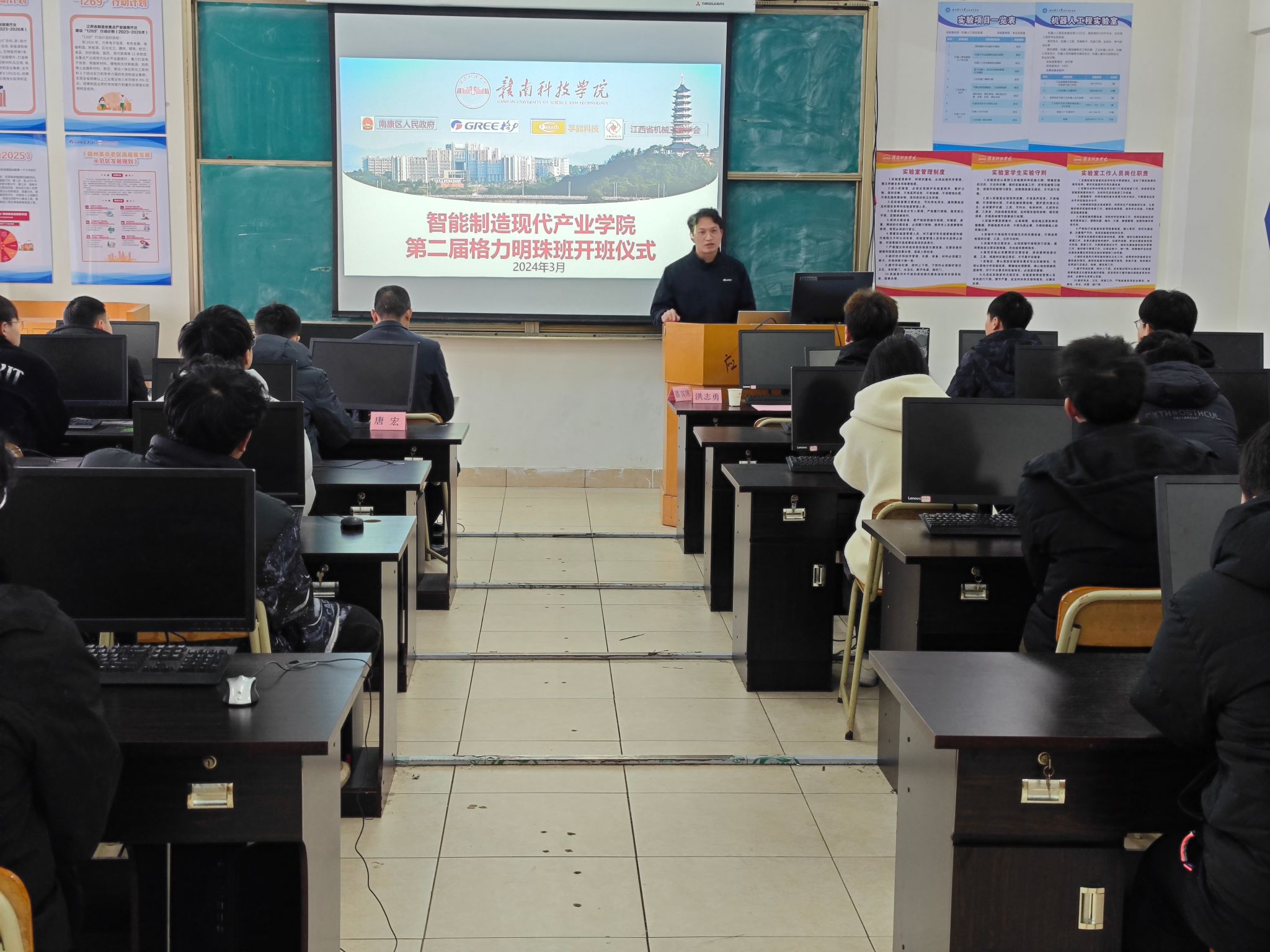本网讯:3月4日上午,智能制造现代产业学院第二届“格力明珠班”开班仪式在工程研究院401举行。智能制造现代产业学院执行院长刘辉、副院长关开荣,格力电器(赣州)有限公司人力资源部部长洪志勇、招聘培训经理黄凯奇出席开班仪式。我校智能制造与机器人教研室主任唐宏、副主任冯凯,产业学院行政部负责人张雨,第二届“格力明珠班”班主任刘懿晨以及第二届“格力明珠班”全体同学参加活动。开班仪式由唐宏主持。
